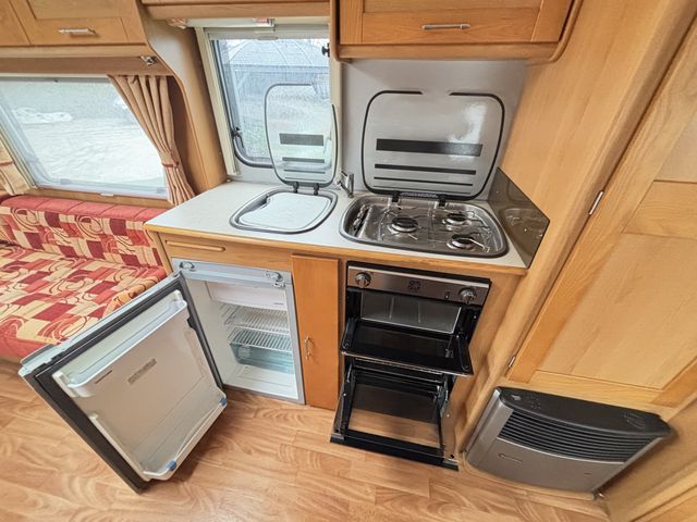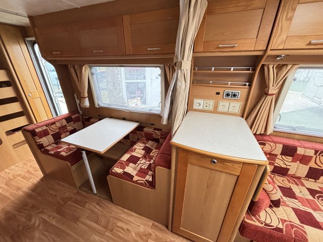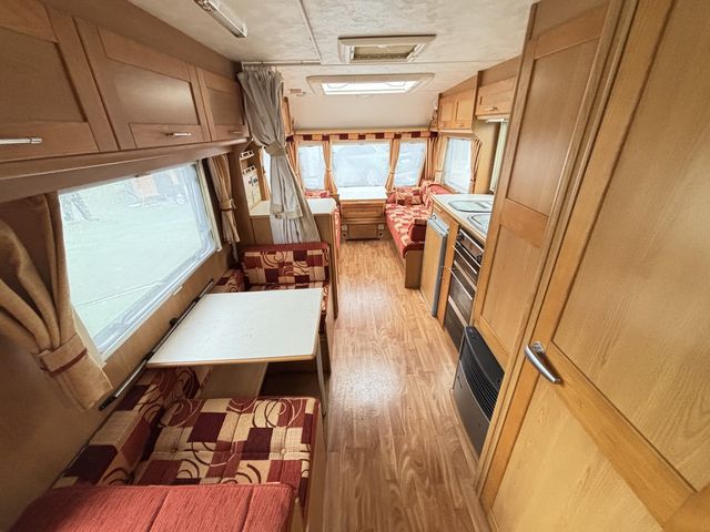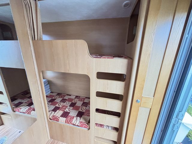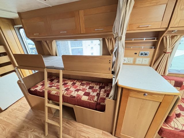 6 személyes családi lakókocsi emeleteságyas gyerekszobával, valamint 2 étkezővel, melyek franciaággyá, illletve emeletesággyá alakíthatóak! Komplett angol konyhával: hűtőszekrény, mosogató, gáztűzhely, gázsütő. Zuhanyfülkével, beépített kazettás wc-vel és melegvízrendszerrel felszerelve! Az ablakokon és a panoráma tetőablakon kombirolókkal, az ajtón szúnyoghálóval felszerelve! Gázfűtéssel és Ultraheat elektromos fűtéssel egyaránt felszerelve, így hideg időben is komfortosan használható! A vontatást stabilizátoros vonófej segíti! A lakókocsihoz tartozik egy zárt elősátor is! Teljesen útra készen adjuk át! Az ár tartalmazza a névre írás költségét is!