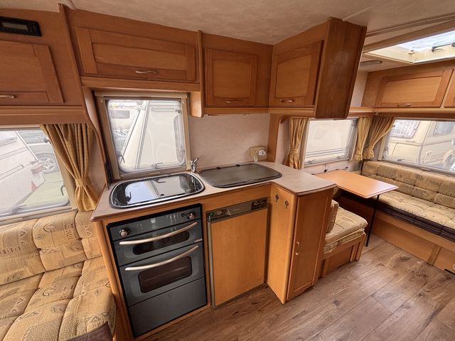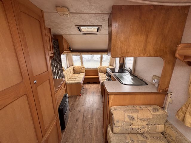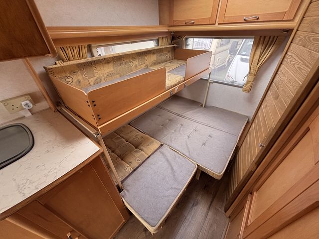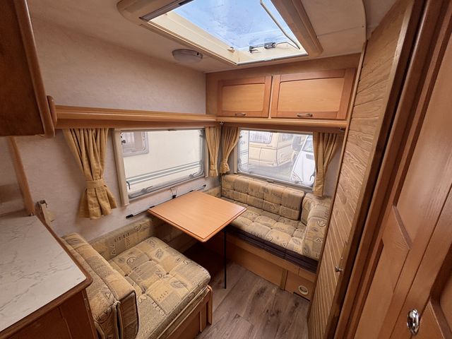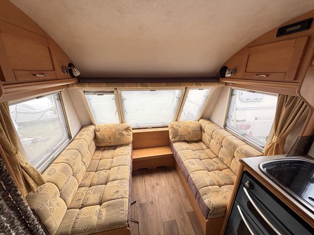 Világos tágas lakókocsi két ülőgarnitúrával, melyek ággyá alakíthatóak, valamint egy lehajtható emeletesággyal, így 5 fő részére nyújt kényelmes fekhelyet! Komplett angol konyhával: hűtőszekrény, mosogató, gáztűzhely, gázsütő! Zuhanyfülkével, beépített kazettás wc-vel és melegvízrendszerrel! Az ablakokon és a panoráma tetőablakon kombirolókkal, az ajtón szúnyoghálóval felszerelve! Gázfűtéssel, valamint ultraheat elektromos fűtéssel, így egész évben komfortosan használható!